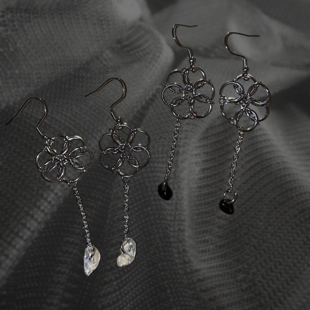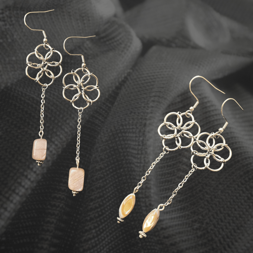 These stainless steel chainlink earrings feature an egg of life design and are decorated with a crystal or shell dangle.